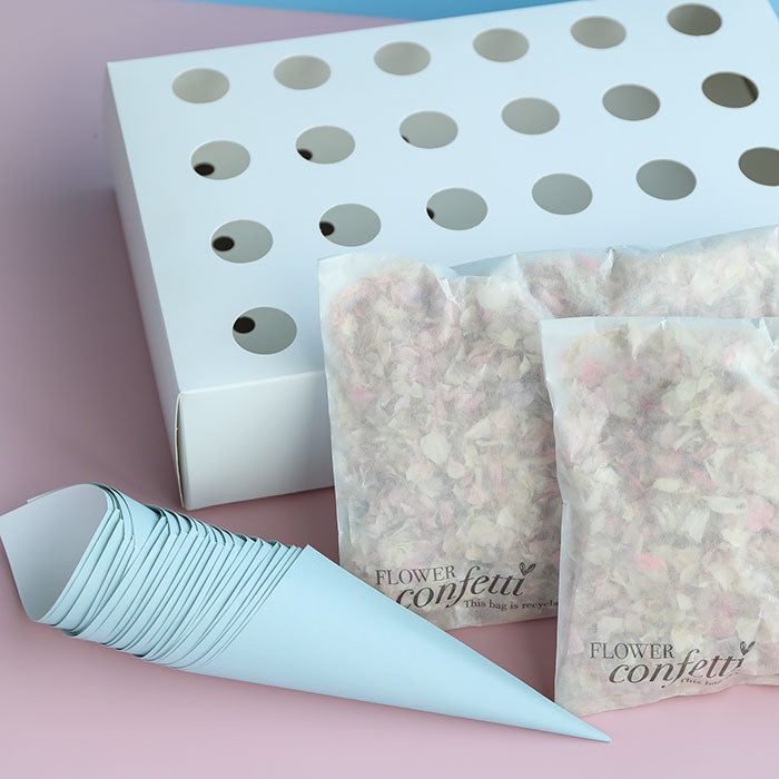 This bundle has everything you ned to make your wedding day as easy as possible. The day before bridesmaids or ushers can put it together in minutes. On the day they hold the try for guests to take a cone, ready for the big confetti throw to celebrate the newlyweds!