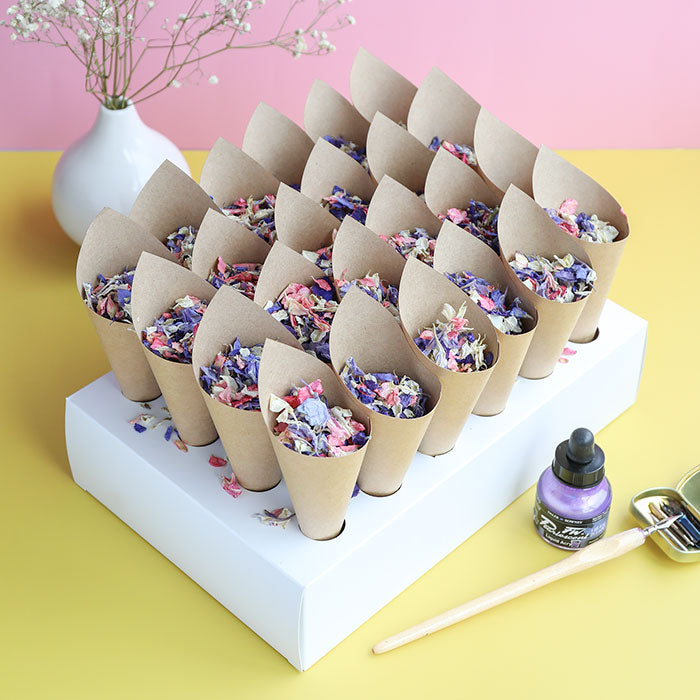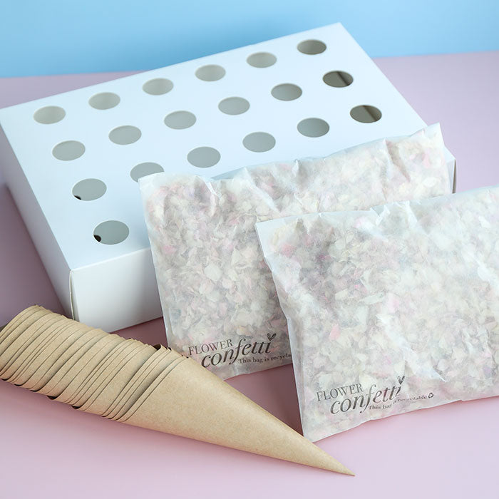 Sustainability: Cones and Tray can be fully recycled as they're made of paper, and the flower confetti will naturally biodegrade in a few days when thrown outside.