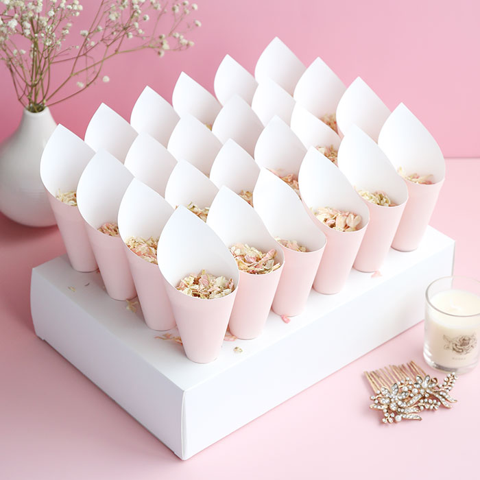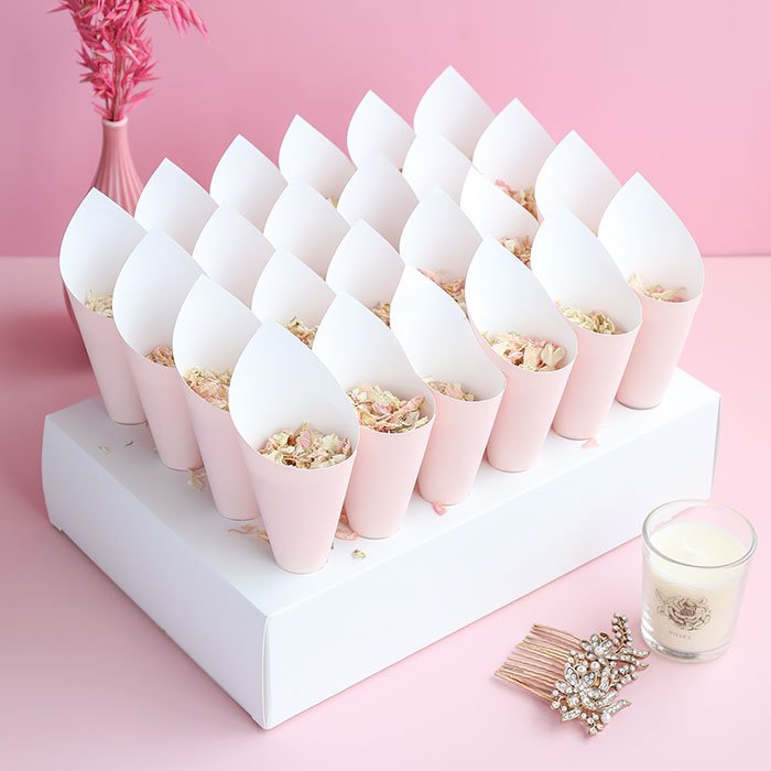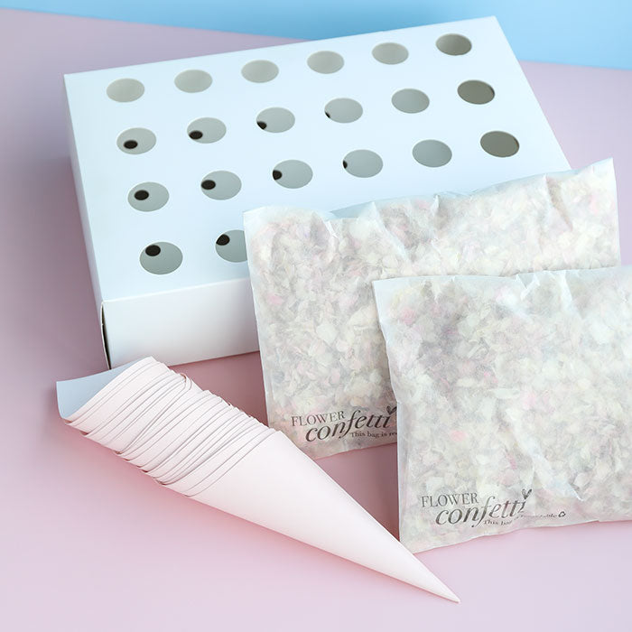 This bundle has everything you ned to make your wedding day as easy as possible. The day before bridesmaids or ushers can put it together in minutes. On the day they hold the try for guests to take a cone, ready for the big confetti throw to celebrate the newlyweds!