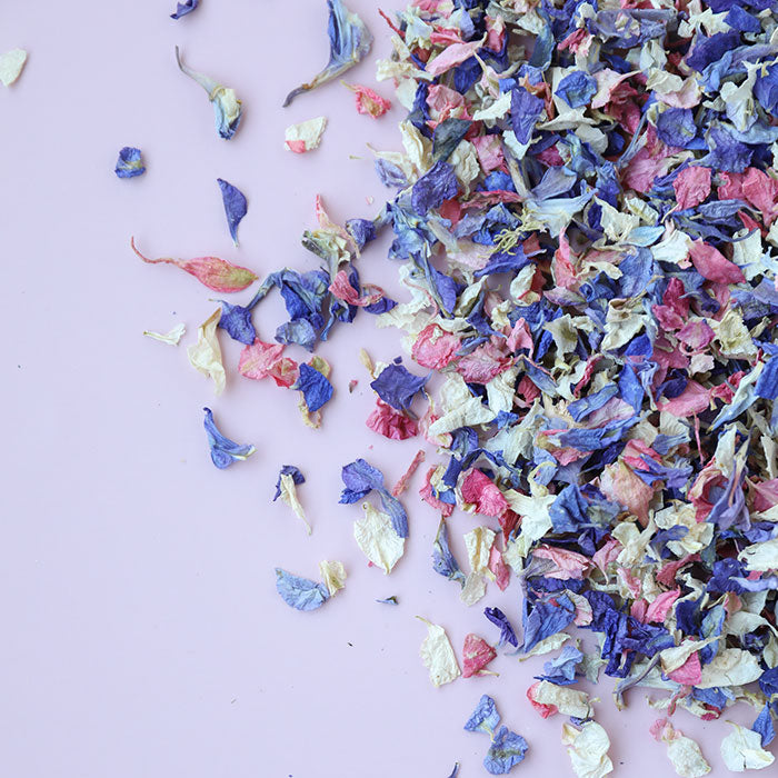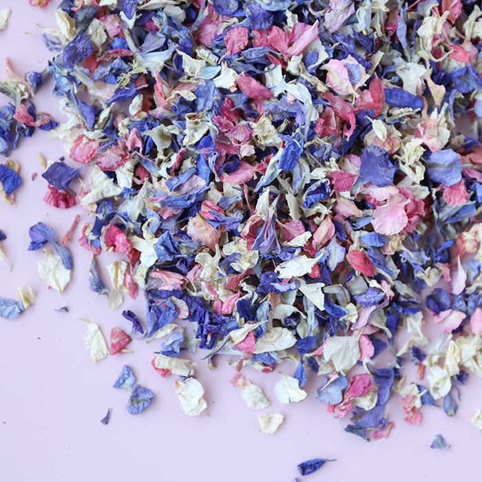 Looking for colour? Purple, Pink, Blue & Ivory Premium Confetti is perfect for adding a smash of colour to your wedding day! Shows up so so well on your confetti photos.